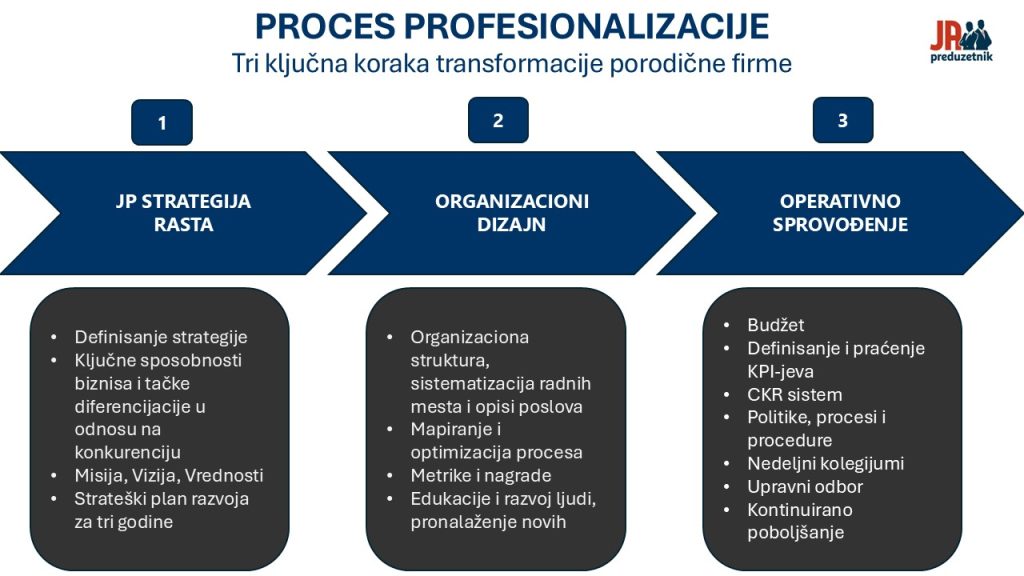 Bez jasne strategije, vaš biznis može postati previše zavisan od vas, ugrožavajući njegov opstanak. Profesionalizacijom gradite stabilnost i omogućavate rast – čak i kada niste prisutni.